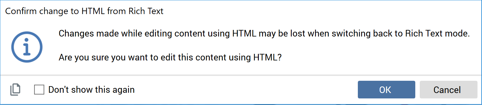 If you check the checkbox at the dialog’s footer, the dialog will not be shown again when changing content editor mode.