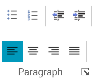 Show the Paragraph dialog box: clicking this button, which is shown at the bottom right of the Paragraph section, displays the Paragraph Properties dialog box, which is documented separately.