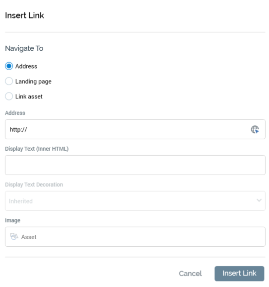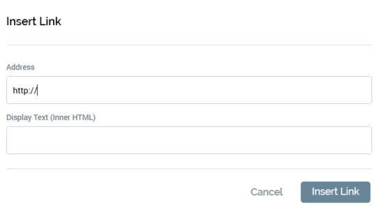 Display Text (Inner HTML): you can optionally provide Display text for the hyperlink. If you provide neither Display text nor an image, the link’s Address is shown. If an Image and Display text are provided, the latter is used as the image’s HTML Alt text.