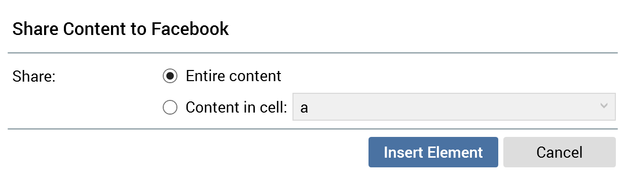Content in cell: this radio button is not selected by default. It is accompanied by a dropdown field that lists all cells within email content that have been defined as shareable. If no cells are enabled for sharing, the radio button and dropdown are disabled.