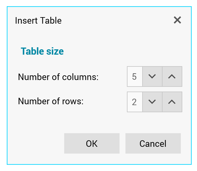 The dialog allows you define the numbers of columns and rows in the table. Clicking OK adds the table to the rich text content and clicking Cancel removes the dialog box from display.