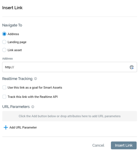 Note that the Realtime Tracking section is not shown when inserting or editing a link in the Landing Page Designer.