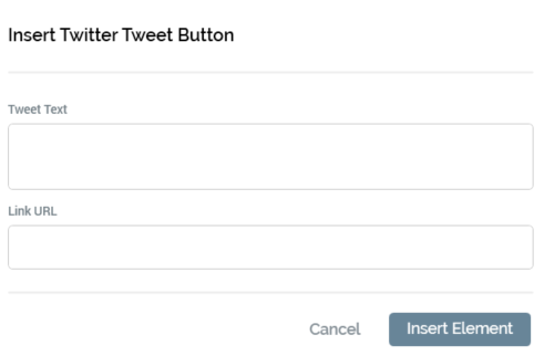 OK: a warning icon is displayed at invocation if neither Tweet text nor Link URL is provided. Clicking OK adds a tag to the current content, e.g.: