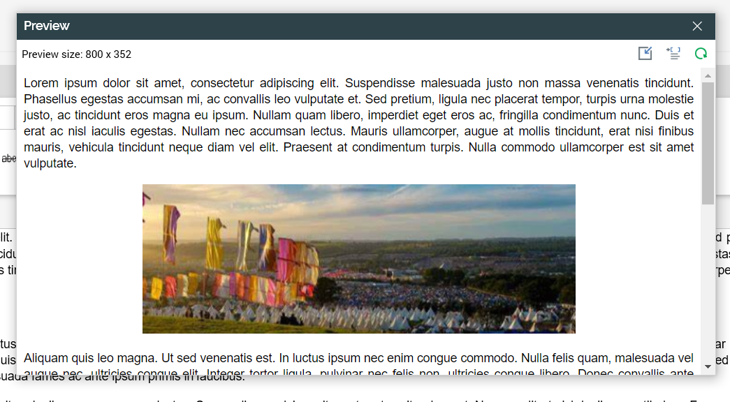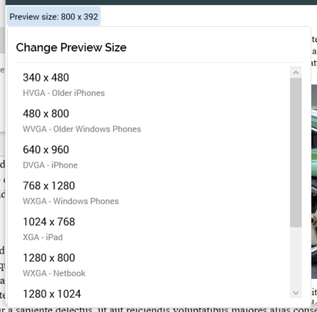 By default, the Preview Window is displayed with a width of 800px. On re-invocation of Change Size, if the size was selected manually, the Preview Window is sized in accordance with your most recently-used selection.