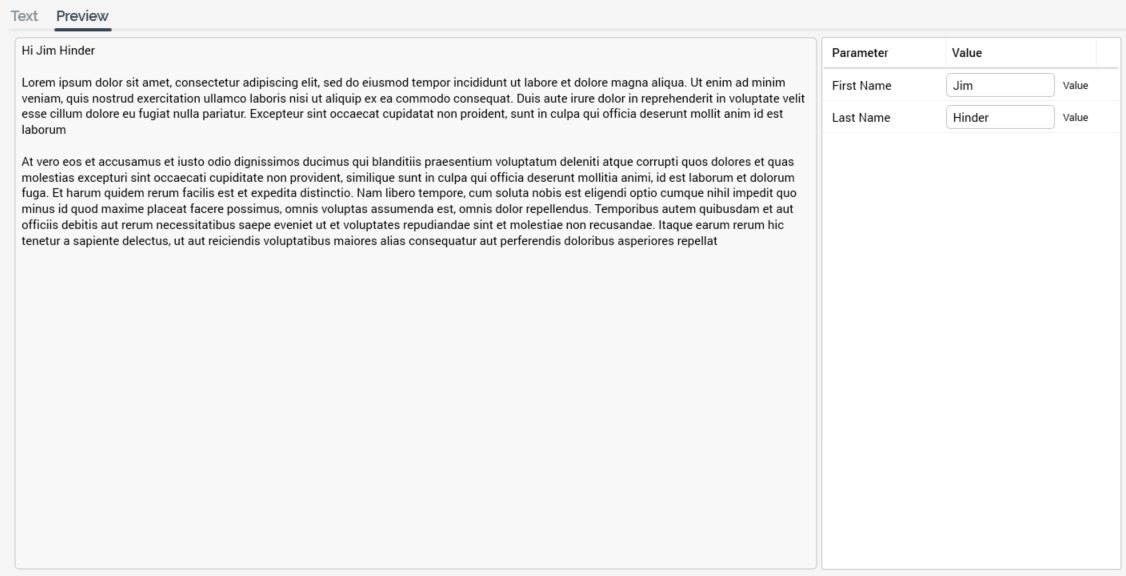 Preview panel: the contents of the text tab are shown, with any parameter values supplied included therein.