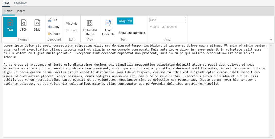 If displaying a text asset, the content panel contains a tab set, exposing two tabs: