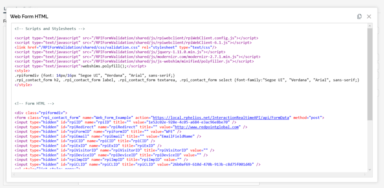 Having copied the web form’s HTML to the clipboard, you can paste it into an external web page, allowing you to make use of RPI web form functionality in that context. Copied HTML must be pasted into the appropriate sections within the web page: