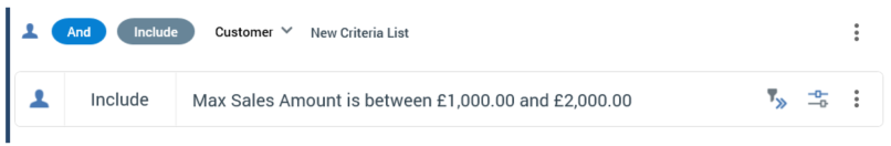 And/Or: this property is only displayed if a root-level criteria list is preceded by at least one other root-level criteria list, criterion or linked selection rule. The property is set by default to ‘And’. If no predecessors exist, And/Or is not shown (there is nothing to which the And or Or can apply). You can change the relationship between a criteria list and its predecessors by clicking directly on And/Or to toggle its value. And/Or is supported at both criteria lists and linked selection rules.