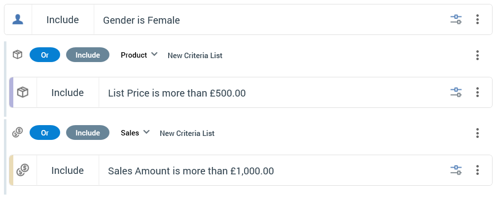Also, having added criteria to a criteria list, you can then define ‘Or’ relationships within discrete lists of related criteria.