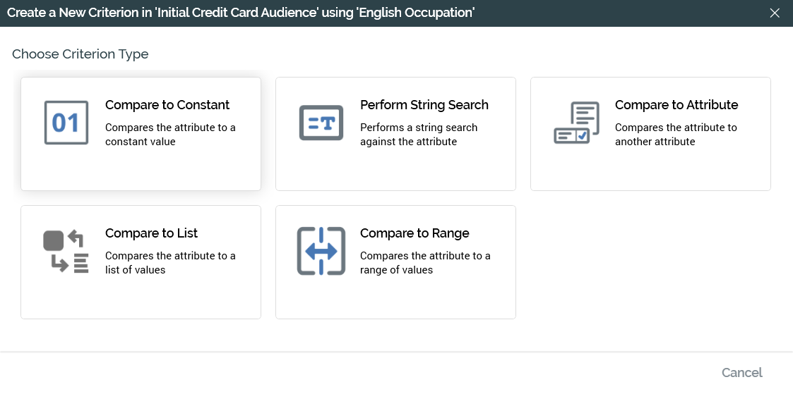The first Criterion Builder interface allows you to choose the type of criterion to create.