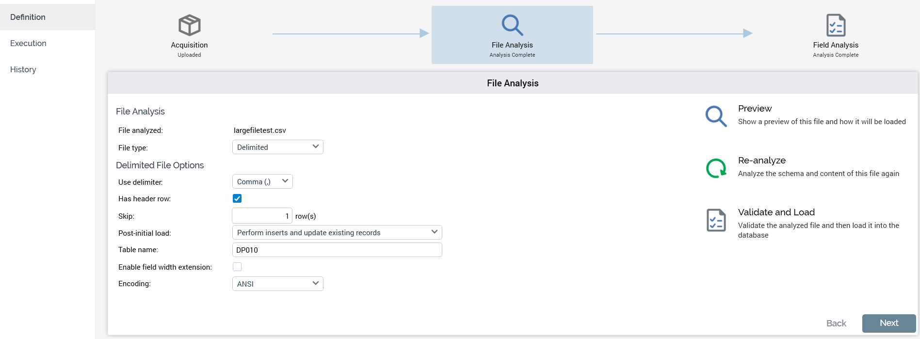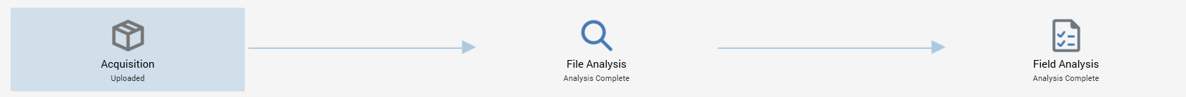 You can navigate between process steps by clicking on icons. You can also use the Back and Next buttons displayed to the bottom right of each panel. Access to certain process steps may be precluded, depending on the current status of the data project (for example, you cannot access File Analysis until you have uploaded and analyzed a file).