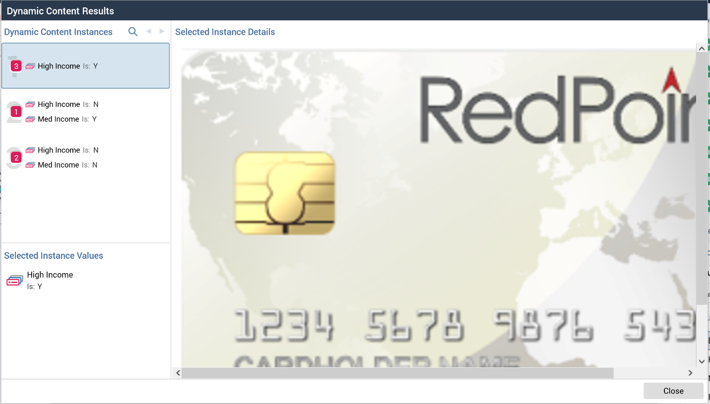 The Dynamic Content Results Dialog is displayed when the View Dynamic Content Results button is clicked when viewing an email or SMS offer’s Results tab.