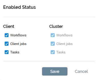 Manage/View Enabled Status at Client/Cluster: clicking this button displays the Enabled Status dialog, which allows you to control the activities undertaken by the currently-selected Execution Service at the current client.