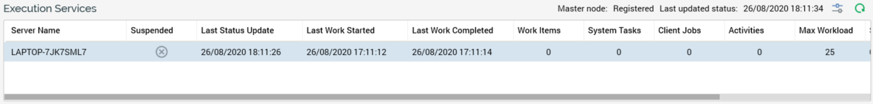 Suspended: an Execution service can be suspended from the Execution Services interface in Server Workbench.