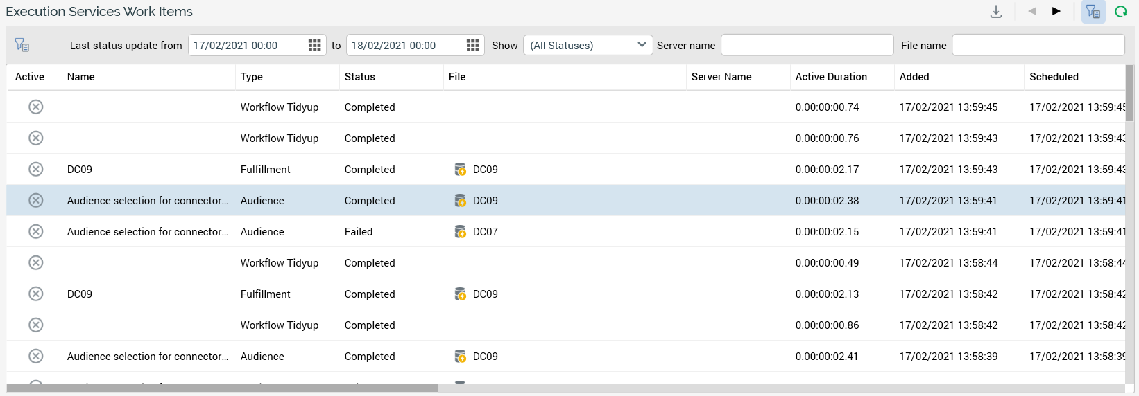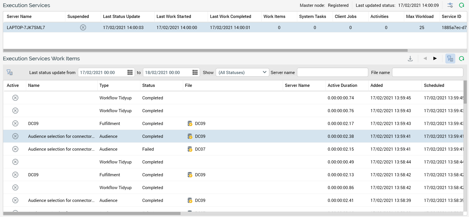 The Execution Services tab provides visibility of work undertaken at the current RPI cluster’s Execution Service(s).