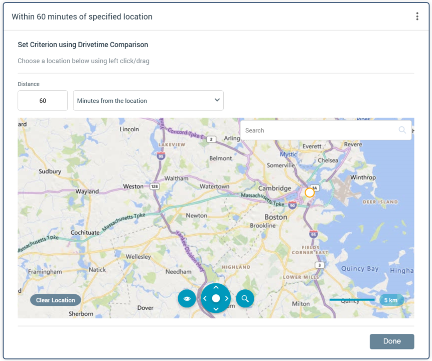 The Drivetime Geolocation allows you to make Realtime decisions on the basis of a visitor's proximity (in distance or time) from a given geographical location. The criterion editor uses a map. The default location displayed in the criterion editor’s map is controlled by user preference Realtime Decision Default Map Location.