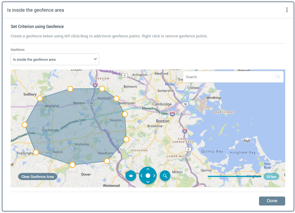 Clear Geofence Area: this button is enabled when a geofence has been added to the map. Clicking it removes the geofence.