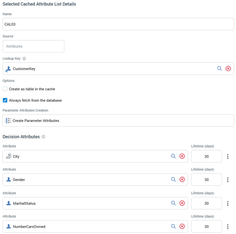 For full details of using cached attribute lists that have been persisted as virtual tables, please see the Database Decision section within the Realtime Decisions documentation.