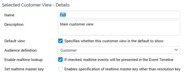 Enable realtime lookup: a checkbox, which, when checked, ensures that realtime events are presented in the Single Customer View's Event timeline. The property is unchecked by default. When checked, the Set realtime master key property is shown.