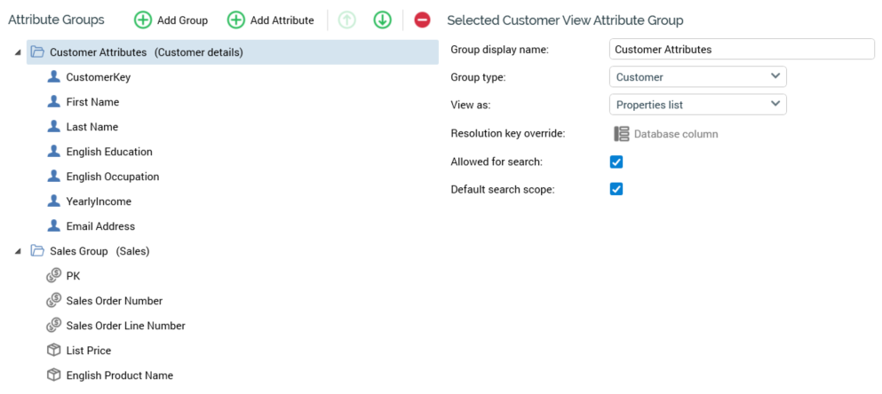 Attribute Groups: this property allows you define sets of attributes to be shown in the Single Customer View. It consists of a toolbar and a treeview.