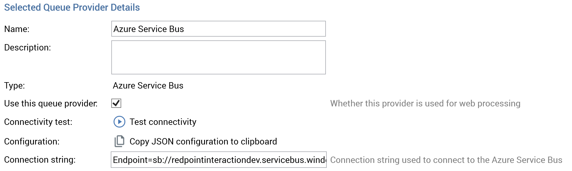 {"Assembly":"RedPoint.Resonance.AzureQueueAccess","Type":"RedPoint.Resonance.AzureQueueAccess.AzureServiceBusQueueFactory","Settings":[{"Key":"ConnectionString","Value":"Endpoint=sb://redpointinteractiondev.servicebus.windows.net/;SharedAccessKeyName=RootManageSharedAccessKey;SharedAccessKey=EcWsxCsX+xOLQCdt0H6kScI1bR252V+WGljpou5MjwQ=","Values":null}]}