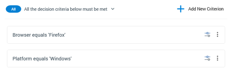 If All/Any is set to All, for the criteria within the decision to be satisfied, the visitor must be using Firefox to browse to the landing page and must be running on a Windows operating system.