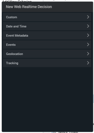 The panel allows you to select the type of decision criterion to add to the Realtime decision. The list of available criteria types differs by Realtime decision type; each is documented separately.