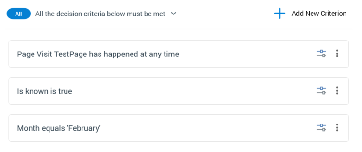 A Realtime decision’s criteria are displayed in a list, shown below the All/Any property and above the Add New Criteria List button: