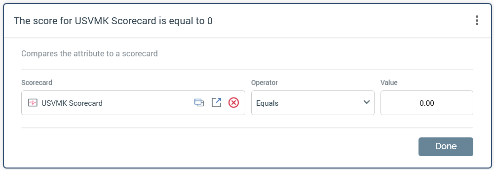 You can create a create a link to a decision scorecard file within a Realtime decision. When you do so, you are specifying that the scorecard be treated as a decision criterion; an operator and value are assigned to the linked scorecard, and are used to determine whether the ‘criterion’ is satisfied or otherwise.