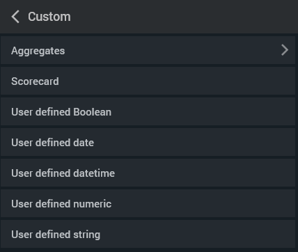 The Custom aggregate menu also provides the ability to add a linked decision scorecard to a Realtime decision, using the Scorecard option. This feature is discussed in the Linked Decision Scorecard section elsewhere in this documentation.