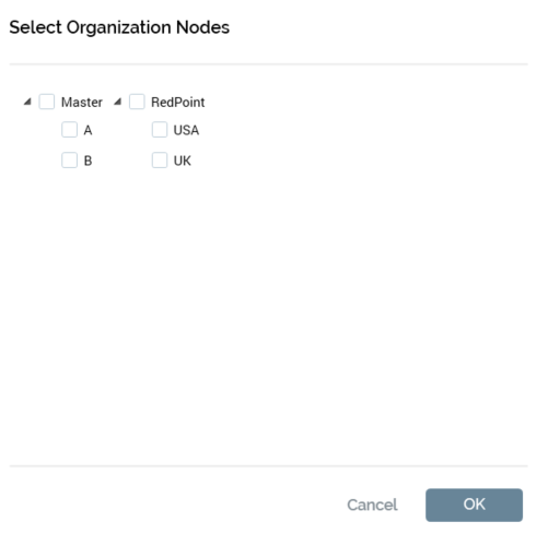 Each organization hierarchy, and the tree of nodes that it contains, are displayed. Each is accompanied by a checkbox (unchecked by default). You can check the nodes to be associated with the resolution level, and then click the OK button to confirm your selection. You can also click Cancel to remove the dialog from display.
