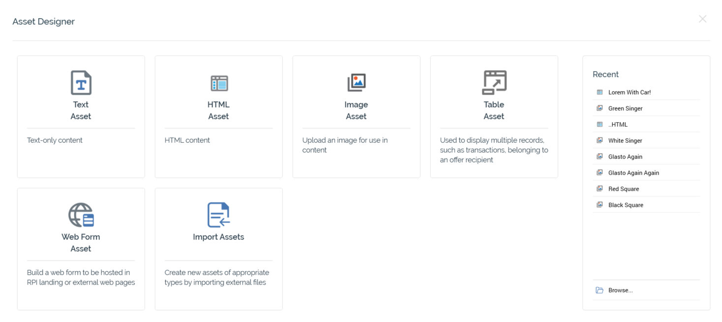 Buttons facilitating creation of the following asset types: