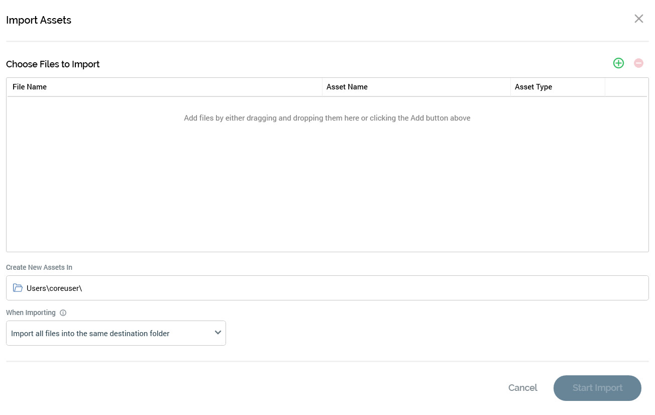 Create new assets in: a folder, which defaults to your user folder. You cannot commence importing files until a folder has been provided. You cannot select an external folder.
