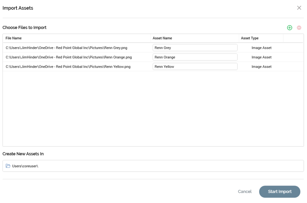 Asset Name: this field is writeable and can be a maximum of 100 characters. It is the name of the file to be created in the RPI file system. Note that you cannot start the import of files until all rows' Asset Names have been provided.
