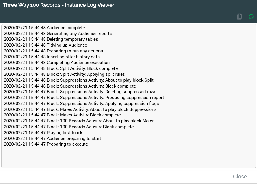 Log: displays the current state of the log for the audience instance as a whole. Log entries are displayed in descending chronological order within the Instance Log Viewer dialog.