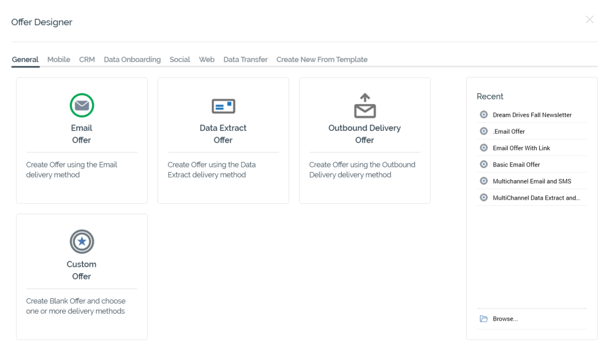 Separate tabs facilitating creation of the following Offer types. Selection of a specific offer type creates a single-channel offer supporting the delivery method in question.