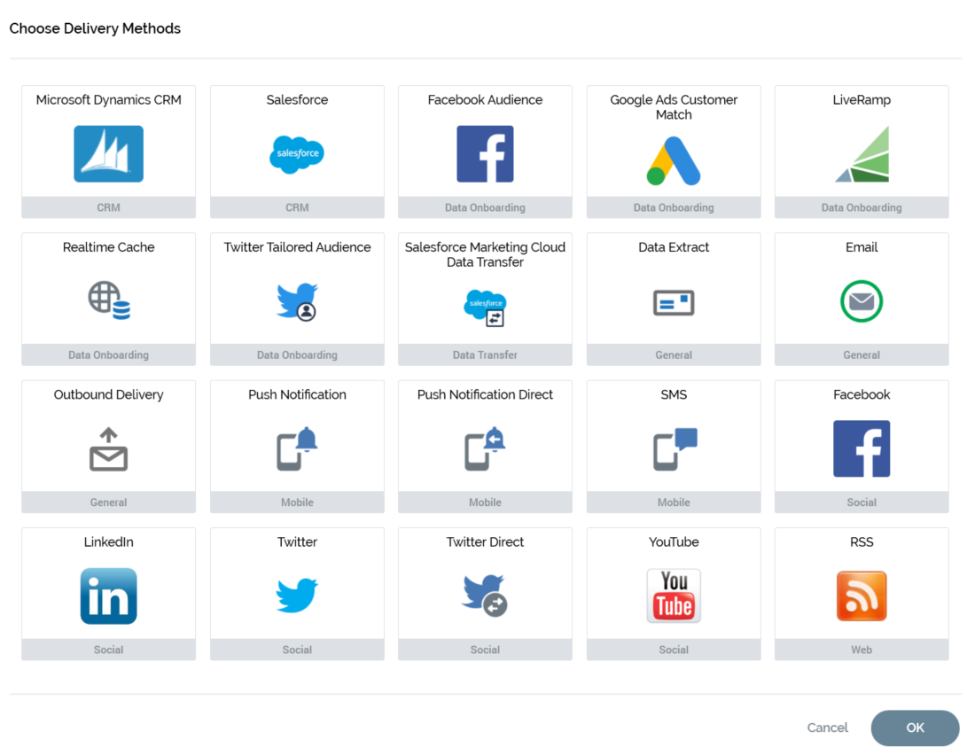 Selection of an offer’s delivery methods is carried out in the Choose Delivery Methods overlay.
