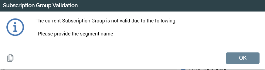 Specific validation errors are outlined in the subscription group documentation. When one or more validation errors is present, a validation error indicator is shown: