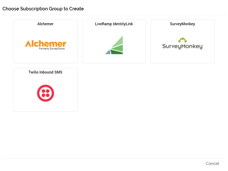 Create New Subscription Group button. Clicking the button displays the Choose Subscription Group to Create overlay, which allows you to specify the type of subscription group that you wish to create: