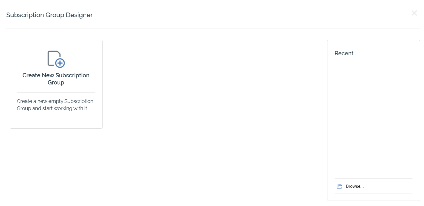 Create new Subscription Group: clicking this button displays the Subscription Group Designer Start Page. A close button is shown to its top right; clicking it removes the overlay from display. If a subscription group containing unsaved changes is displayed at invocation of Create New, an 'Are You Sure?' dialog is shown, from which you can: