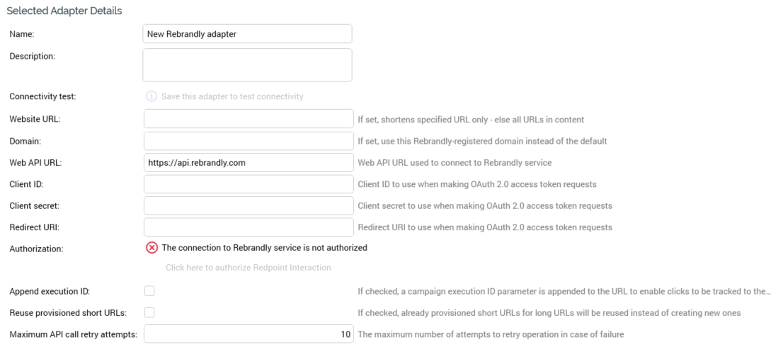 When a Rebrandly adapter is selected in the web adapters list, the Selected Adapter Details section contains the following updateable fields: