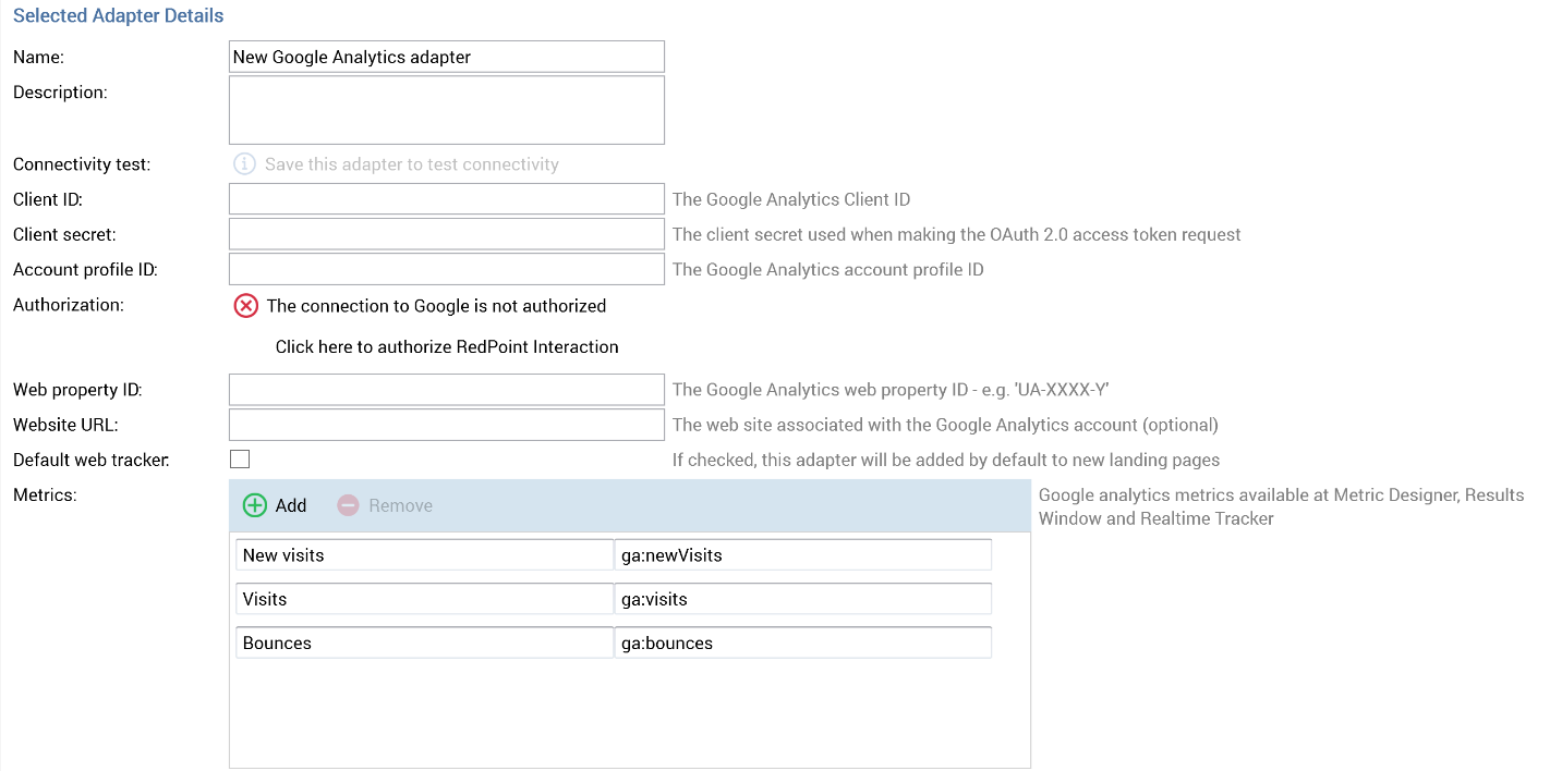 When a Google Analytics adapter is selected in the web adapters list, the Selected Adapter Details section contains the following updateable fields: