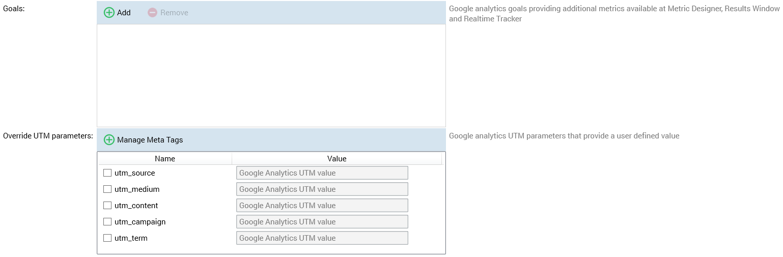 Metrics: this grid allows you specify the subset of Google Analytics metrics that will be made available at the Results Window. The grid contains the following: