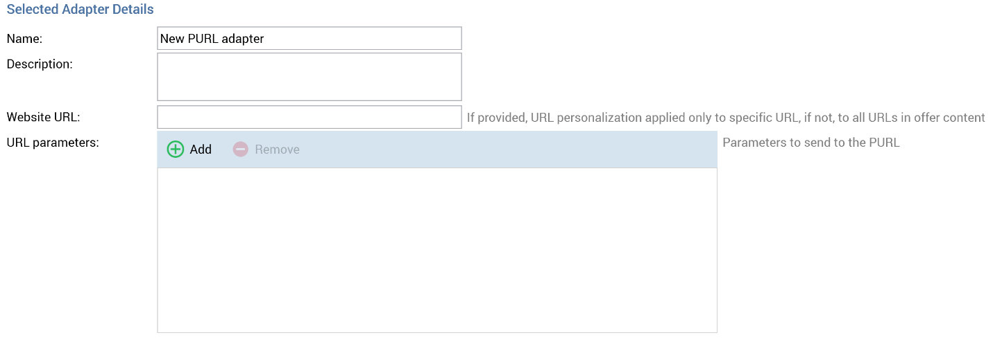 Name: a mandatory text field that can be a maximum of 100 characters in length. Set by default to 'New PURL Adapter' (an integer can be appended to ensure uniqueness).