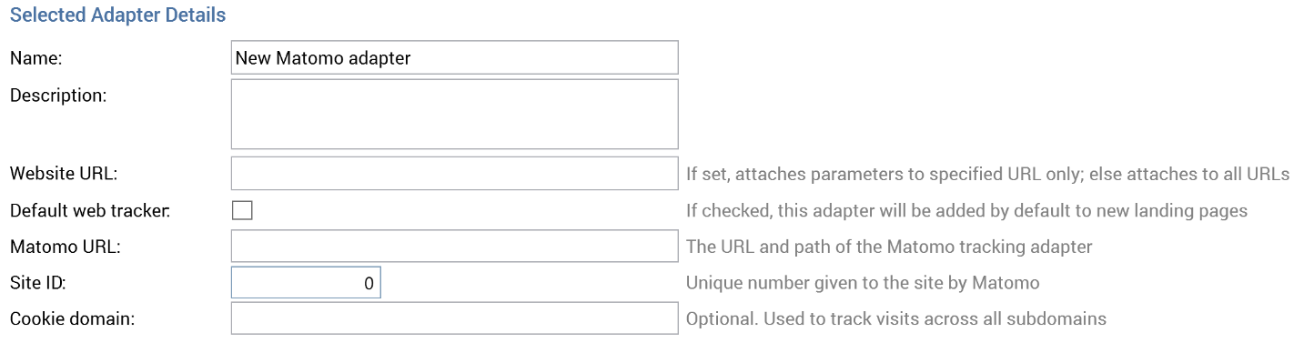 When a Matomo adapter is selected in the web adapters list, the Selected Adapter Details section contains the following updateable fields: