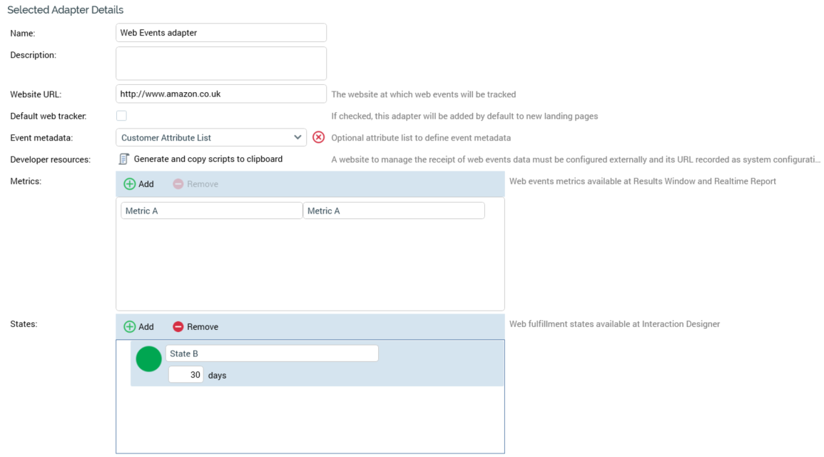 Developer resources: clicking the Generate and copy scripts to clipboard allows a web developer to generate scripts that can then be inserted at appropriate positions in an external website. Note that a website to manage the receipt of web events data needs to be configured externally, and its URL recorded as system configuration setting WebEventTrackingAddress. The button is not available until the web adapter is saved.