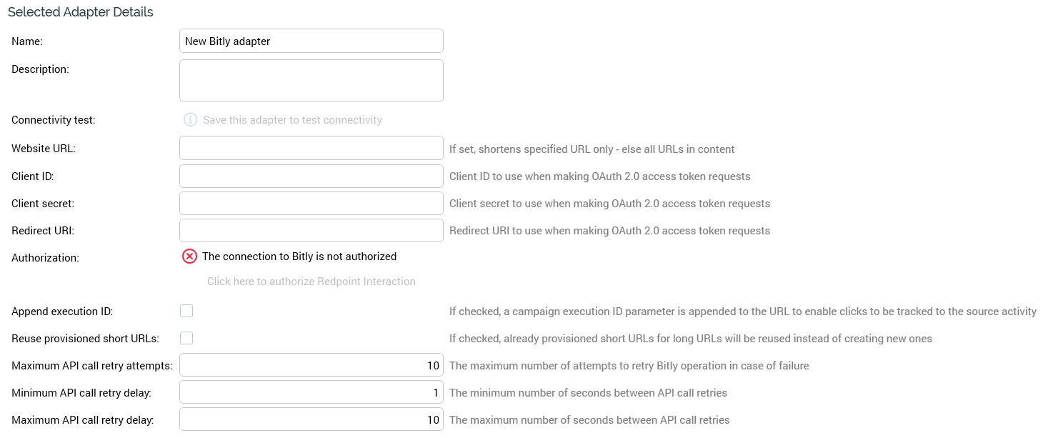 When a Bitly adapter is selected in the web adapters list, the Selected Adapter Details section contains the following updateable fields:
