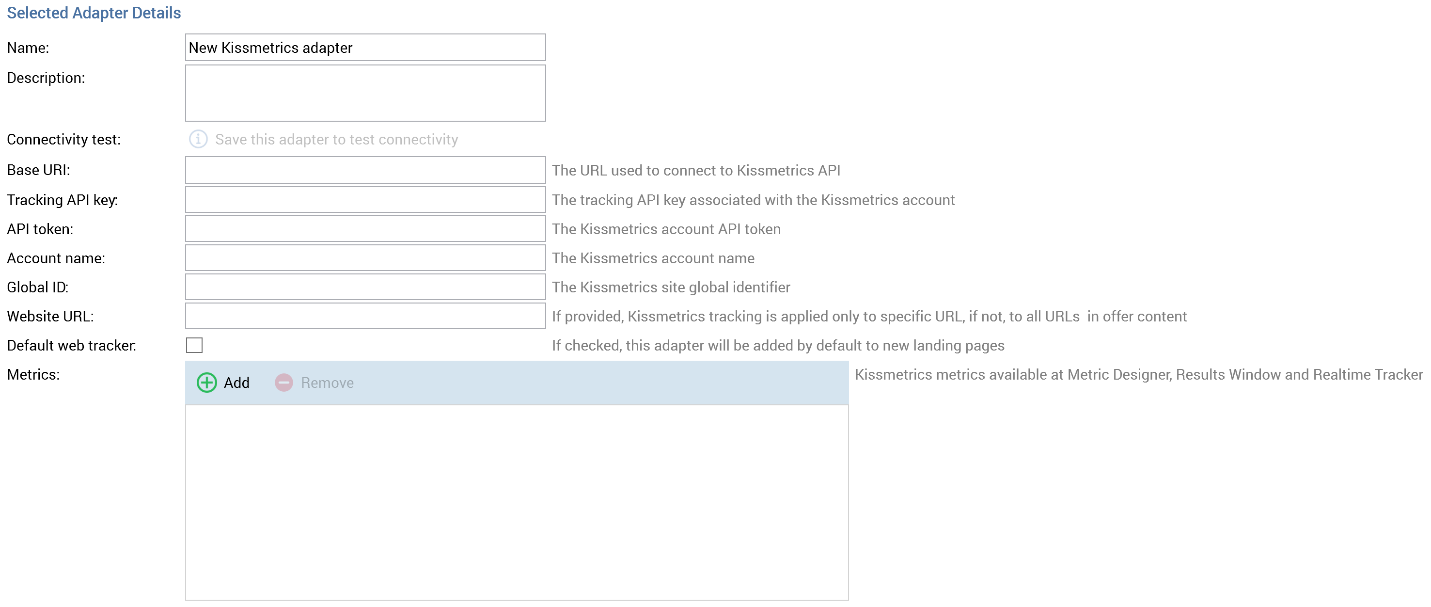 When a Kissmetrics adapter is selected in the web adapters list, the Selected Adapter Details section contains the following updateable fields: