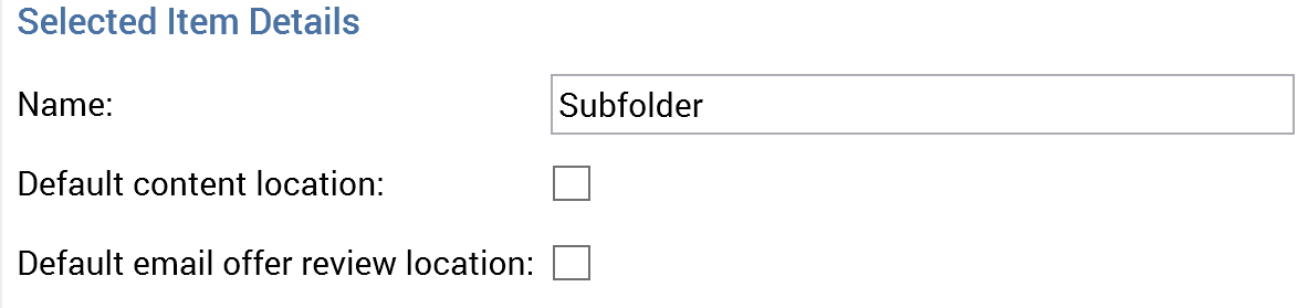 Default email offer review location: this property allows you to define a web publish site or folder as the default location to which email offer content will be staged for review. When it is selected, the location's matching treeview node icon is augmented with a blue circle at its bottom right. A validation error is raised at save if you attempt to set more than one Default email offer review location.