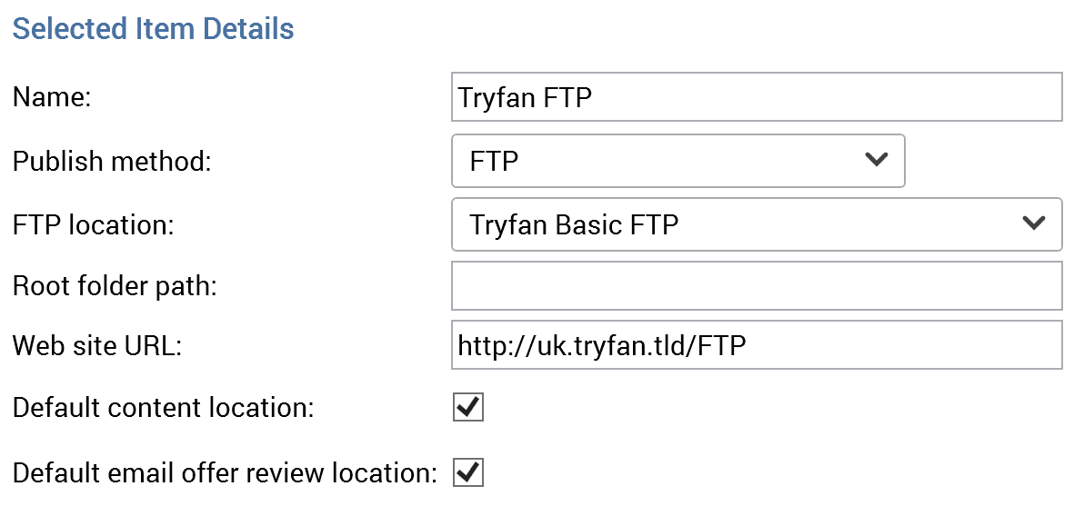 If an FTP web publish site is selected, the following fields are shown: